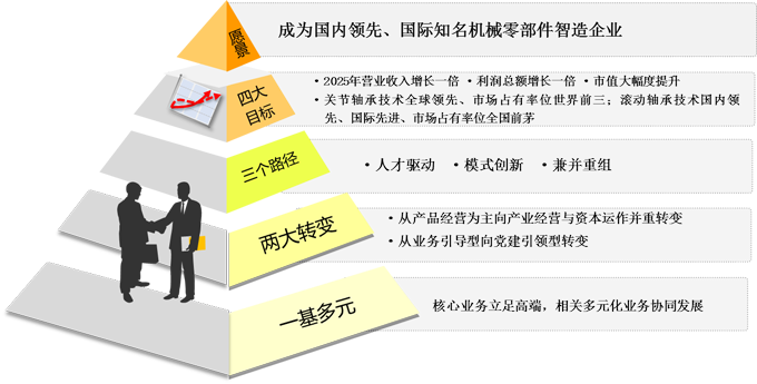 保持战略定力,以需求牵引供给,以供给创造需求,精心谋划“一基多元”为基点的发展战略,打造国内领先、国际知名的机械零部件智造企业。