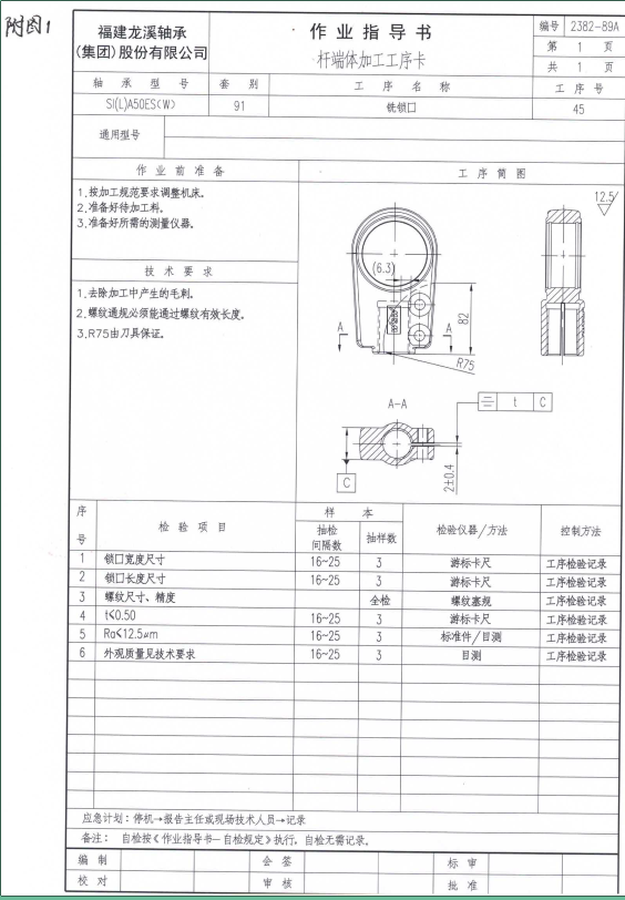 工艺试件为SI(L)A50ES(W).91杆端体,材料:45钢,工序:铣锁口。工艺要求见图纸(附图1)。