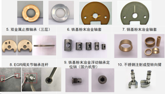 长沙波德冶金材料有限公司主要产品包括止推轴承、浮动轴承支撑套、止推轴承挡板、止推垫片、含油轴承等,主要应用车用、船用、坦克和步兵战车等三大应用方向的涡轮增压器粉末冶金轴承和黄铜合金轴承上。如下图所示: