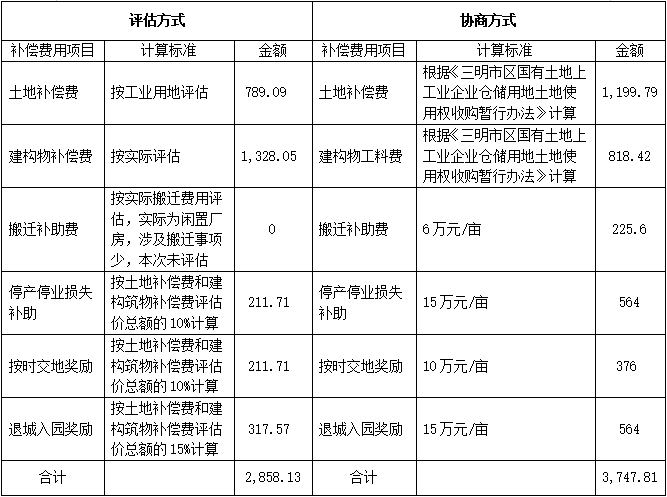 福建省三明齿轮箱有限责任公司陈大镇厂区工业用地征迁补偿方式对比表