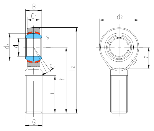 产品特点:镶垫杆端关节轴承杆端体材料是碳钢,表面镀锌,滑动表面镶入青铜衬垫;内圈材料是轴承钢,淬火,球面镀硬铬,除了孔径小于6.35外,其余均可通过油杯润滑。