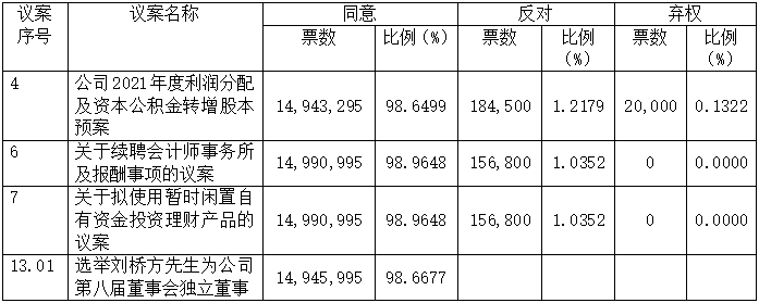 本次股东大会审议的议案十三采用累积投票制,此议案的表决结果仅统计列示表决同意股数及比例。