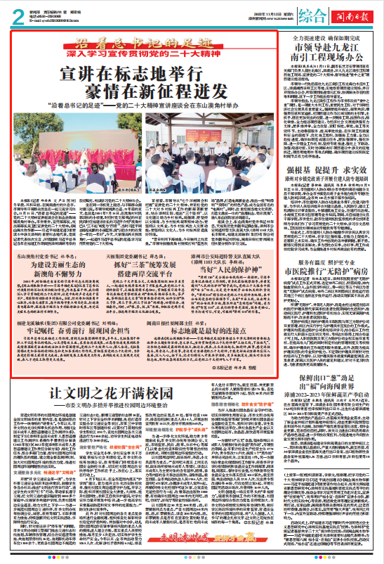 本报讯(记者 邱丹燕 文 严洁 图)初冬早晨,风和日丽,在闽南渔村的休息亭,市领导和干部群众围坐在一起交流学习体会。11月11日,“沿着总书记的足迹”——党的二十大精神宣讲座谈会在东山县陈城镇澳角村举办。市委常委、宣传部部长、统战部部长吴卫红宣讲党的二十大精神。《闽山闽水物华新——席大大福建足迹》重要读本中涉及漳州的重要标志地代表、党媒记者代表依次发言,深情回顾席大大总书记当年在福建工作期间到漳州调研考察的殷切嘱托,畅谈学习党的二十大精神体会。